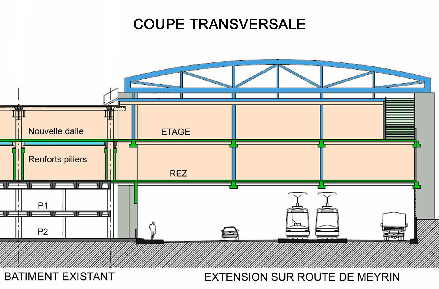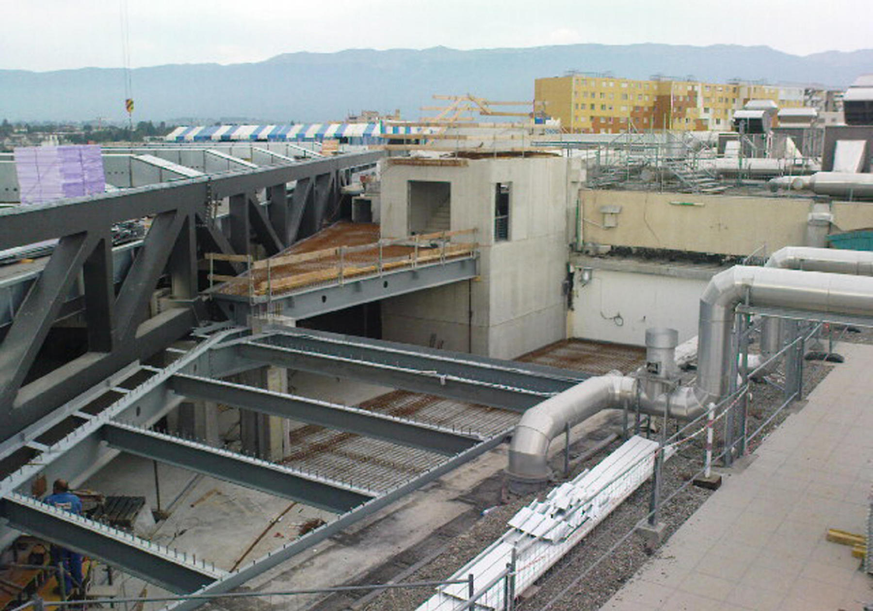 Le projet d’extension ouest, enjambant la route de Meyrin, propose 7’600 m² de surface de vente supplémentaire sur deux niveaux et 840 m² de bureaux en toiture. La structure de la partie extension a été exécutée par les bureaux T ingénierie & ZS ingénieurs civils.