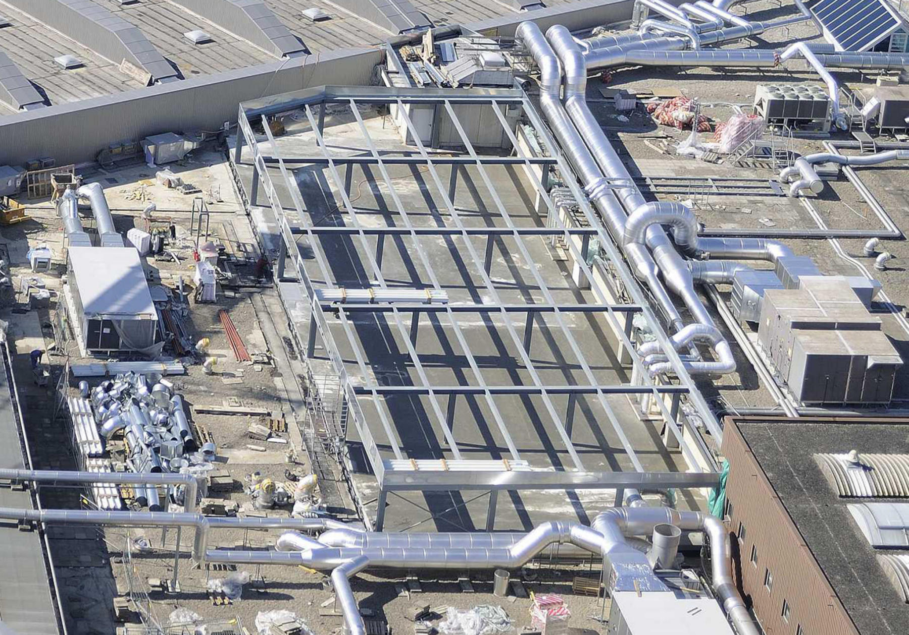 Les travaux de transformation et de liaison au bâtiment existant ont été effectués par étapes, les commerces restant en activité. La solution d’une structure en dalle mixte Acier-Béton, de 17m de portée, a été choisie pour la création des nouvelles dalles. La création des bureaux en toiture a nécessité la démolition de la toiture existante afin de recréer un plancher environ 1m au-dessus du niveau existant et ainsi augmenter la hauteur sous plafond à l’étage.