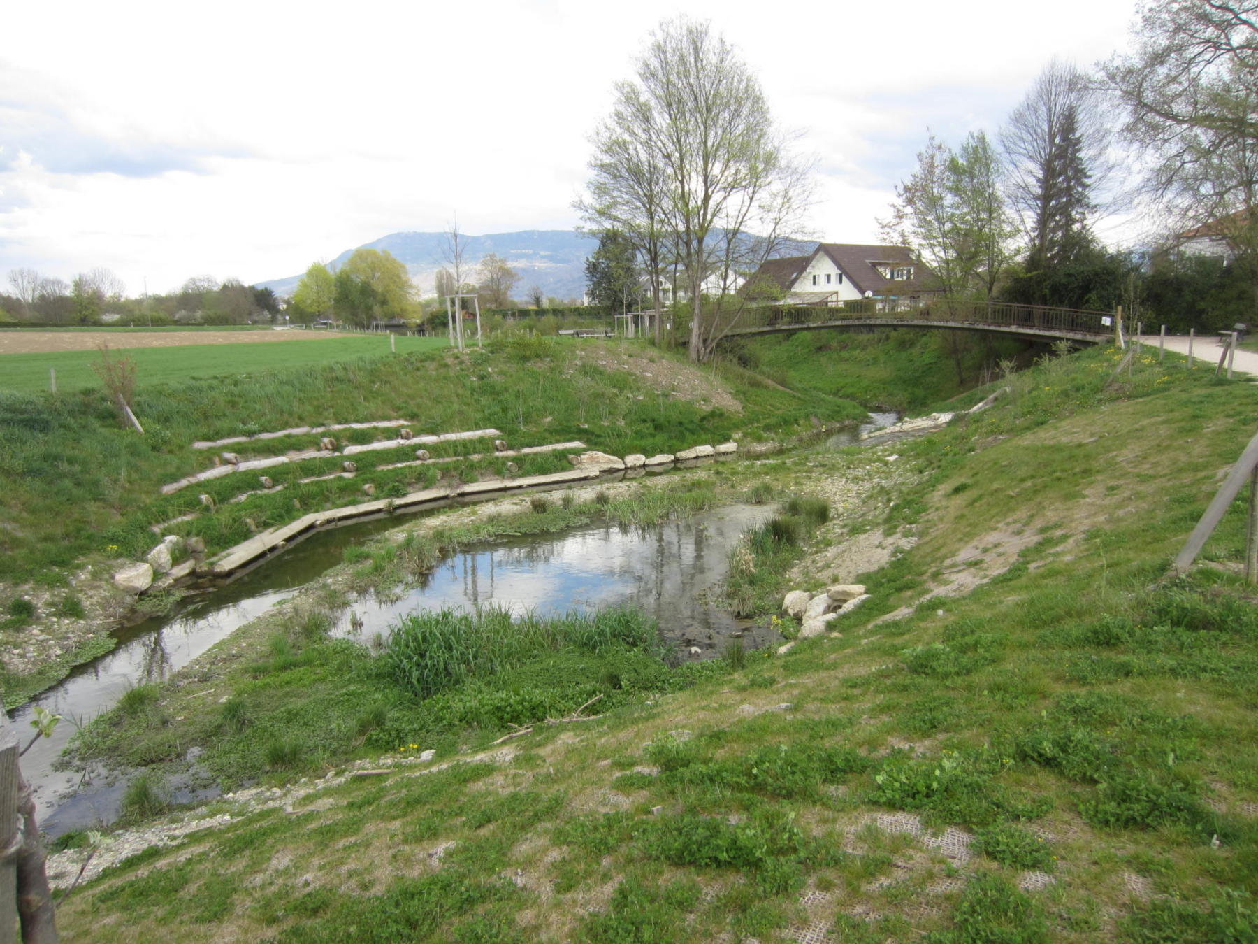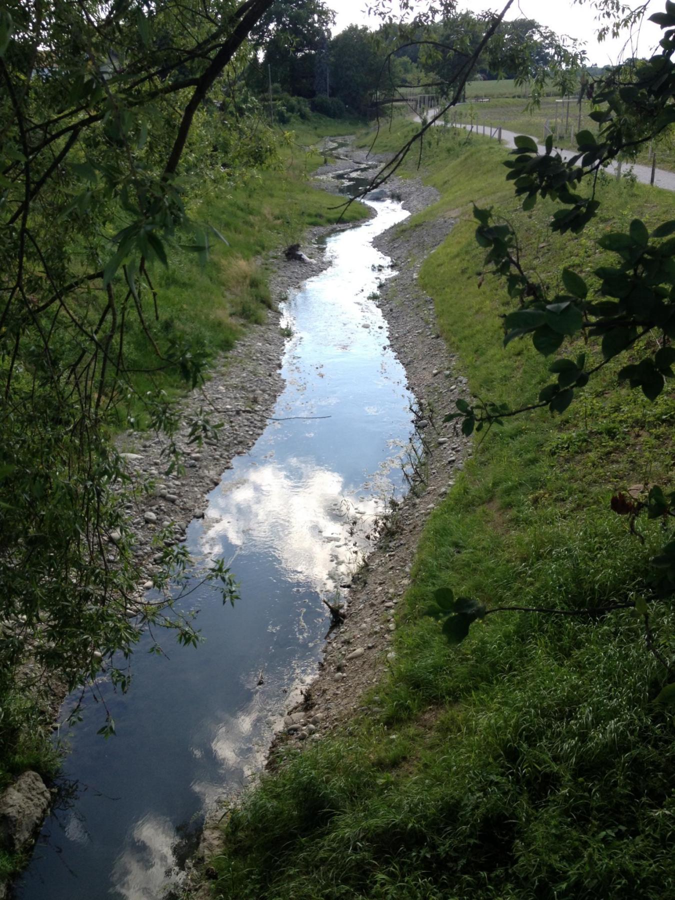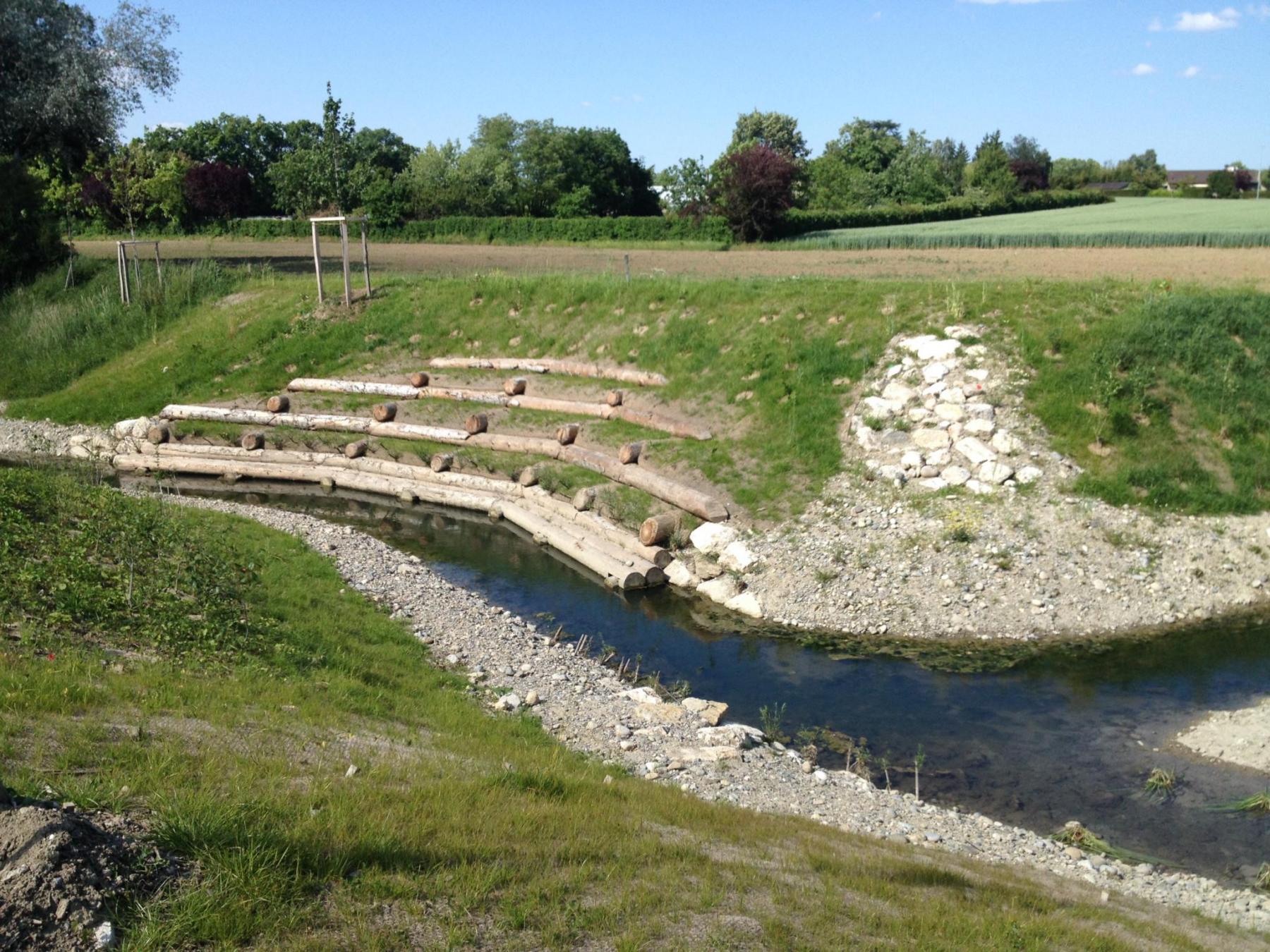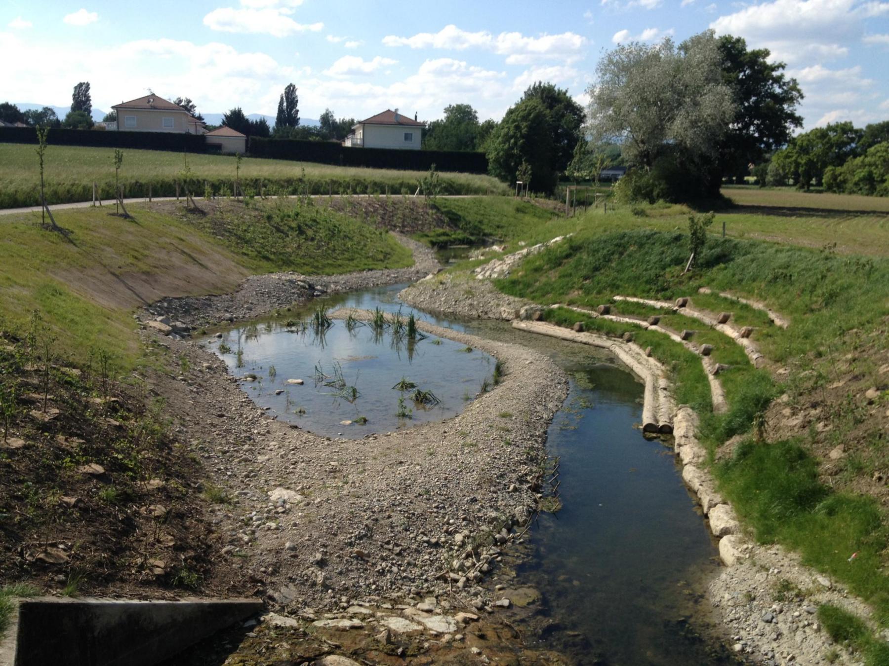 • Démolition de la cunette bétonnée, création d’un méandrage du cours d’eau afin de créer une bonne diversité des écoulements, création de zones humides annexes pour augmenter la biodiversité et créer des biotopes relais ;
