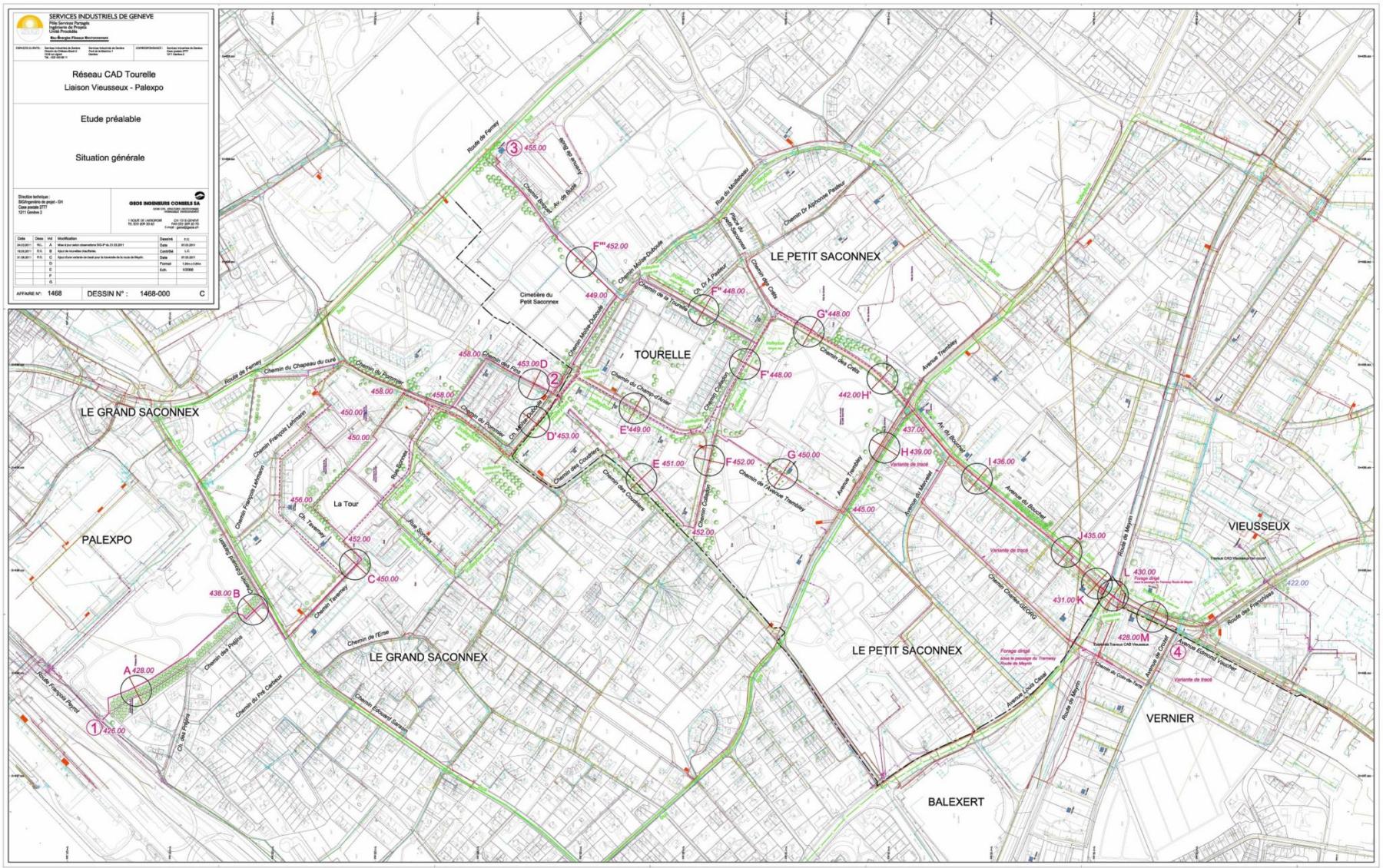 Etudier et définir le tracé optimal d’une liaison entre 2 réseaux de chauffage existants afin de créer une possibilité de bouclage et de permettre de raccorder plusieurs chaufferies importantes désireuses être reliées au réseau de chauffage à distance des Services Industriels de Genève.